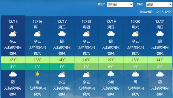 成都未来三天以阴天和多云为主,最高气温在15℃以下。